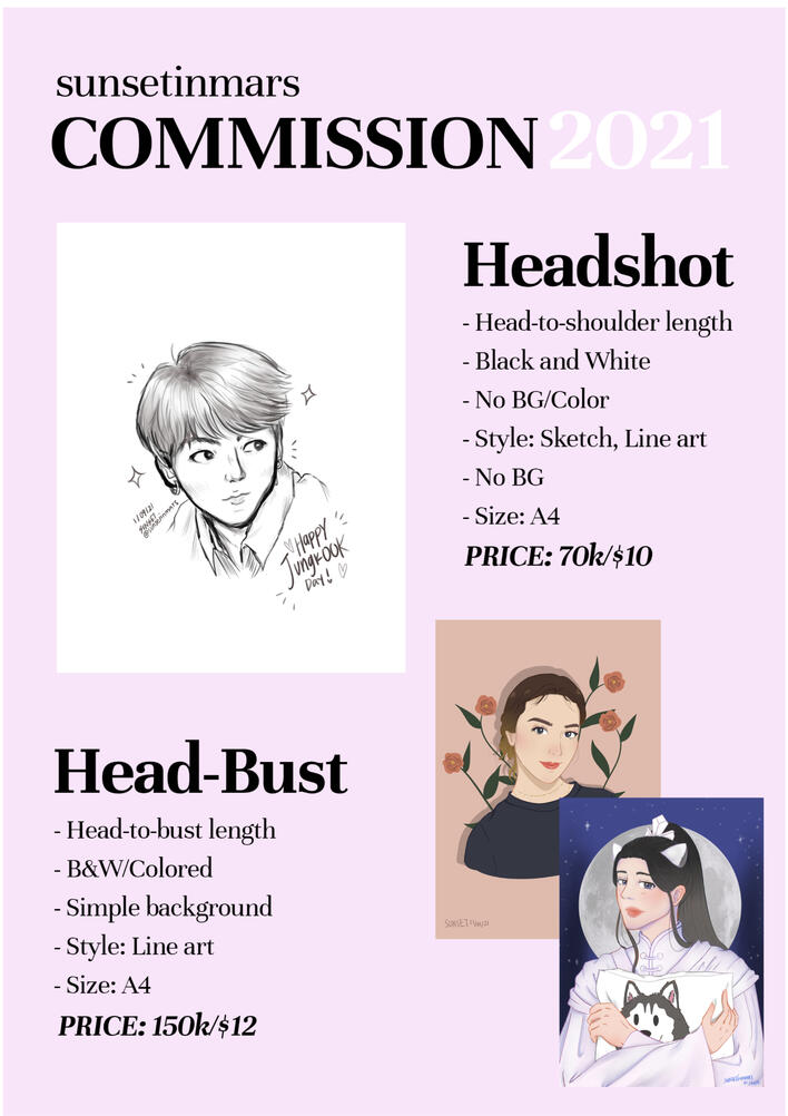 Hey, guys! I'm @sunsetinmars and I'm a digital illustration artist from Indonesia. I enjoy making commissions with anime references and portraits. Welcome to my commission page!